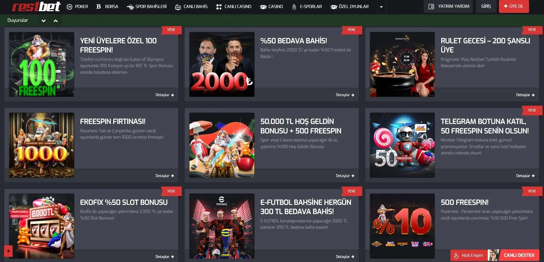 Eski adresi Restbet.com olan site, artık güncel giriş adresi üzerinden hizmetlerini vermektedir. Güvenilir bahis ortamı ve casino deneyimi için mutlaka en doğru adresimizi kullanın. Restbet’e giriş sonrası yüksek kalitede oyun hizmetleri ile sorunsuz erişim imkanı ile sizleri misafir ediyor.